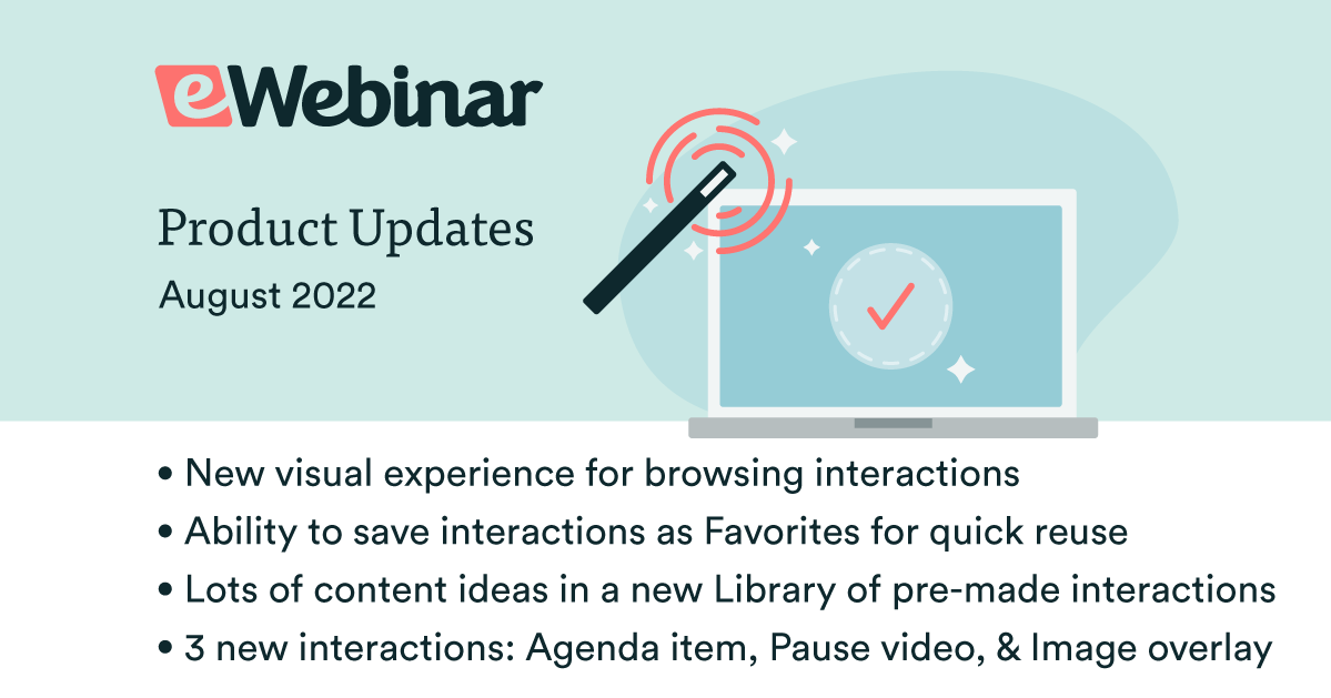 When creating a new eWebinar, you can now choose from a variety of templates that'll help you get started quickly. Some templates have an instructional video to give you tips on how to structure your presentation. Every template comes with a suggested schedule, pre-written email notifications, default interactions you can edit, and content ideas for your registration pages. Look out for more templates coming soon!
