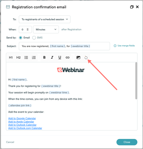eWebinar's integration with BombBomb lets you insert video messages into your email notifications (registration confirmations, reminders, and follow-ups), whether that means importing an existing video from your BombBomb account or recording a new one on the spot.