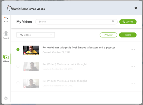 - Alternatively, you can click Videos on the left side of the modal to access videos already saved to your BombBomb account. To add one of them: