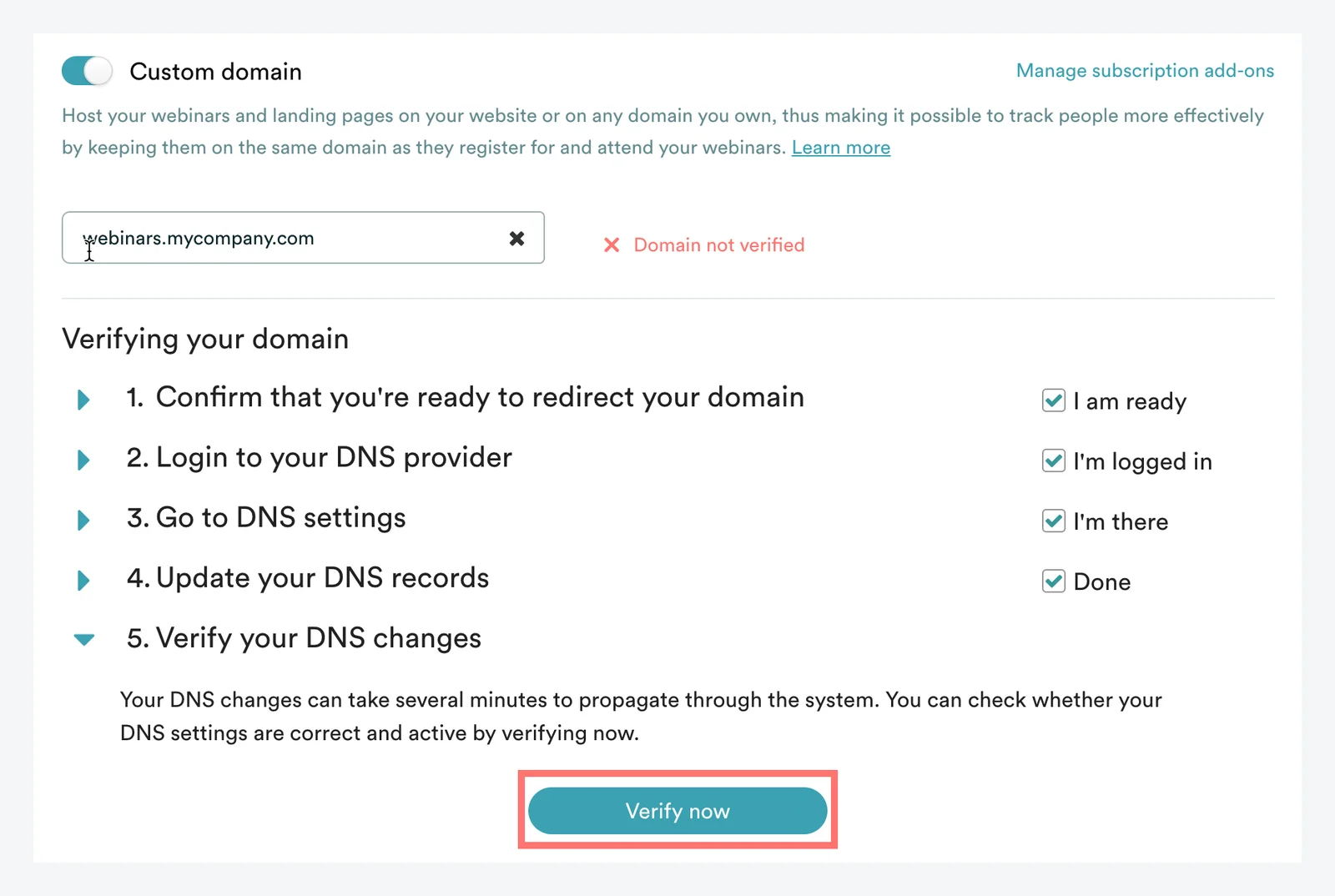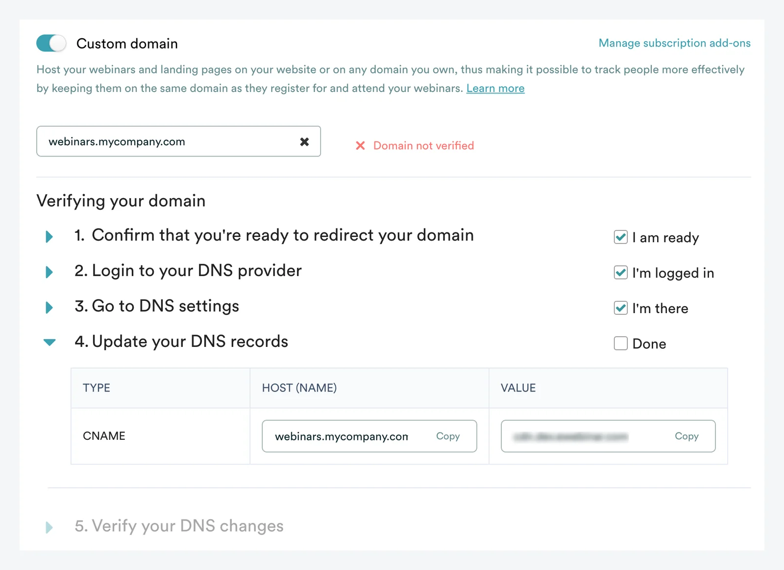 NOTE: When you choose to put your webinars on your own domain, you must do it under a subdomain, such as webinars.mycompany.com.