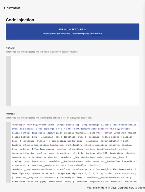 Note you can also do this on a per-page basis if adding the widget to all your pages is too much. You can do so in a similar way but first select the Page and then go into Advanced and Code Injection.