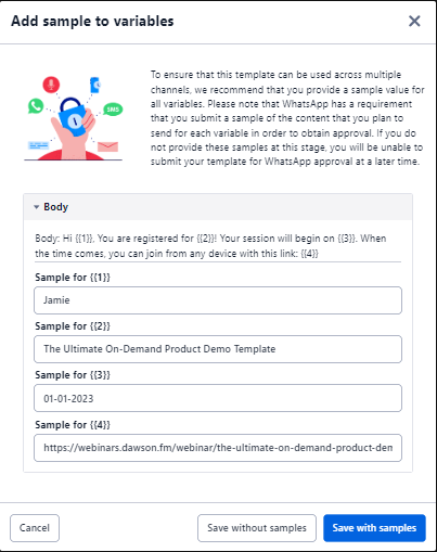 Add in samples to the variables, these should be as close to what the end message will end up looking like when it's sent to a user. Click Save with samples.