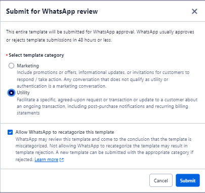 The verification process usually takes only a few minutes, but it can take up to 48 hours, so be patient. Twilio can reject your template, in which case you will have to submit a new template from scratch. Contact them directly if you have trouble getting a template verified. Read Twilio's docs on template approval here to make sure you will get approved.