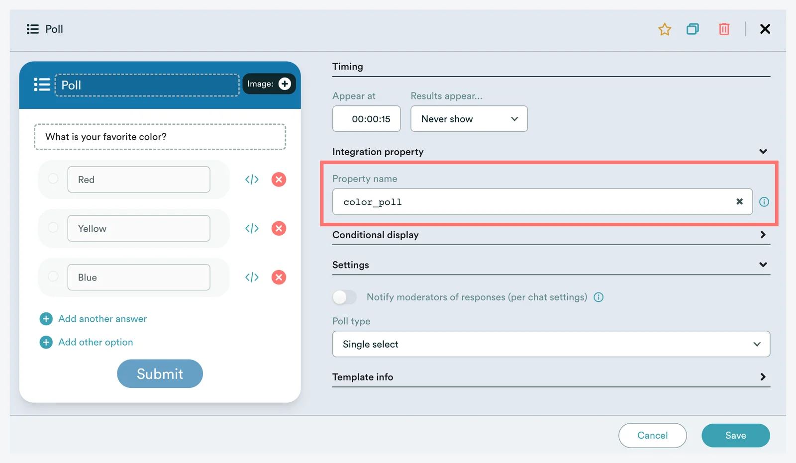In the example below, a poll was created asking the favorite color of the attendee and the new poll's property was named 'color_poll'.