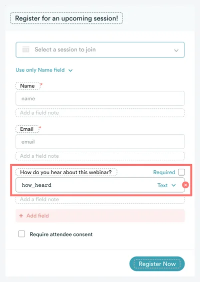 For example, when you add a question to the registration form, as shown below, a new property is automatically created n the database. You can then give the property a name (in this case, 'how_heard') so you can use it elsewhere (i.e. map it to a field in your CRM).