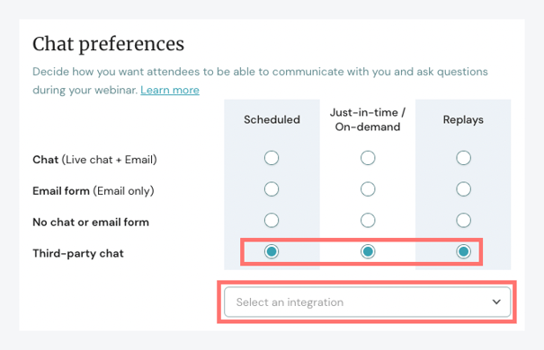 3. Switch your Chat Preferences to Third-party chat for the types of sessions you'd like to add your chat to, Scheduled sessions, Just-in-time/On-demand sessions, and/or Replays.