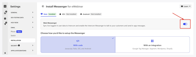 2. From your Intercom dashboard, go to Settings → INSTALLATION