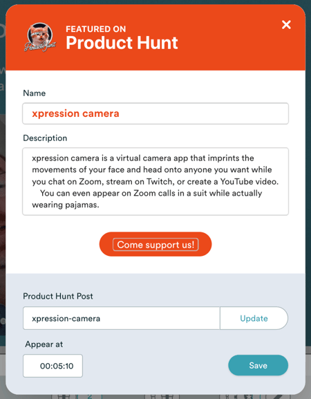 - Product Hunt interaction card: Use this special interaction card to direct attendees to your launch post on Product Hunt so they can support your launch!