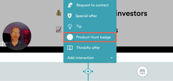 While you are in the process of creating the eWebinar you plan to use to promote your Product Hunt launch, if you go to the Interactions tab, you’ll see the Product Hunt badge card in the list of interactions to choose from.