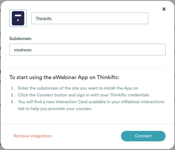 - Enter the Subdomain you use on Thinkific, click Connect, sign in with your Thinkific credentials, and you're ready to go!