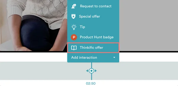 While you are in the process of creating the eWebinar you plan to use to sell your Thinkific course, if you go to the Interactions tab, you’ll see the Thinkific offer card in the list of interactions to choose from. Keep in mind you must have at least one published course before you can use it.