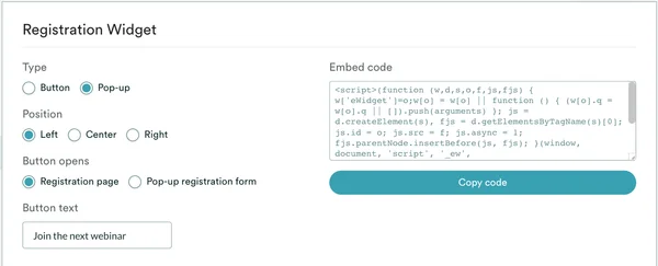 - Configure the widget, making sure to select Pop-up as its Type, and then copy the code.