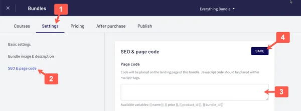 - If you selected a bundle, go to the Settings menu, select SEO & page code, paste the widget code in the Page code input box, and click Save.