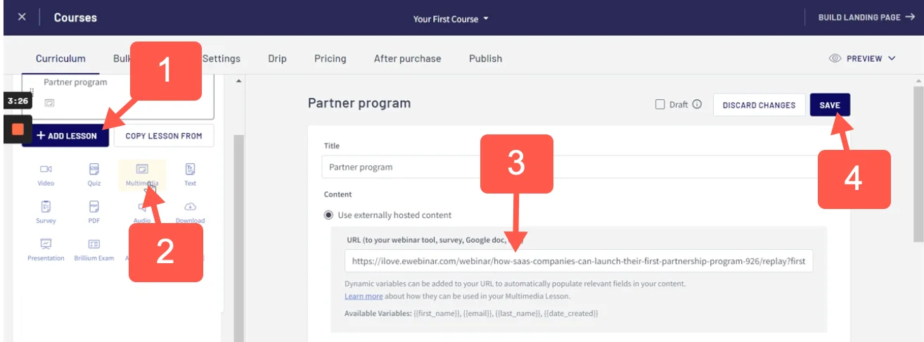 To embed one of your eWebinars as a multimedia lesson in your Thinkific course, take the following steps: