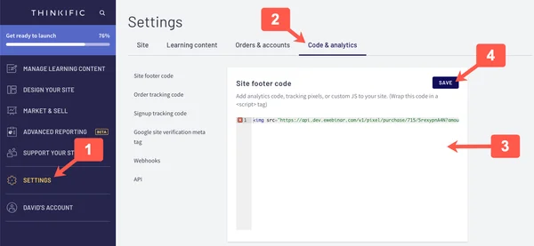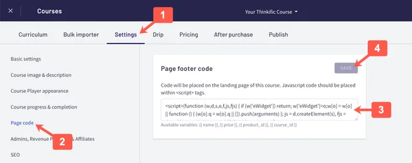 - If you selected a course, go to the Settings menu, select Page code on the left, paste the widget code in to the Page footer code input box, and click Save.