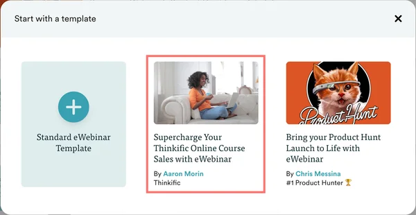 When you go to create your eWebinar, choose the Thinkific template.