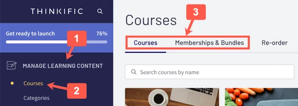 - Go to the Courses or Memberships & Bundles tab and select the course or bundle where you would like to install the eWebinar widget on its landing page.