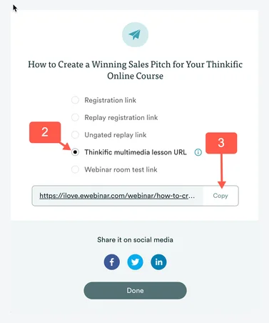 - In the Share modal that opens, select the Thinkific multimedia lesson URL. (You will not see this option until you connect your Thinkific and eWebinar accounts.)