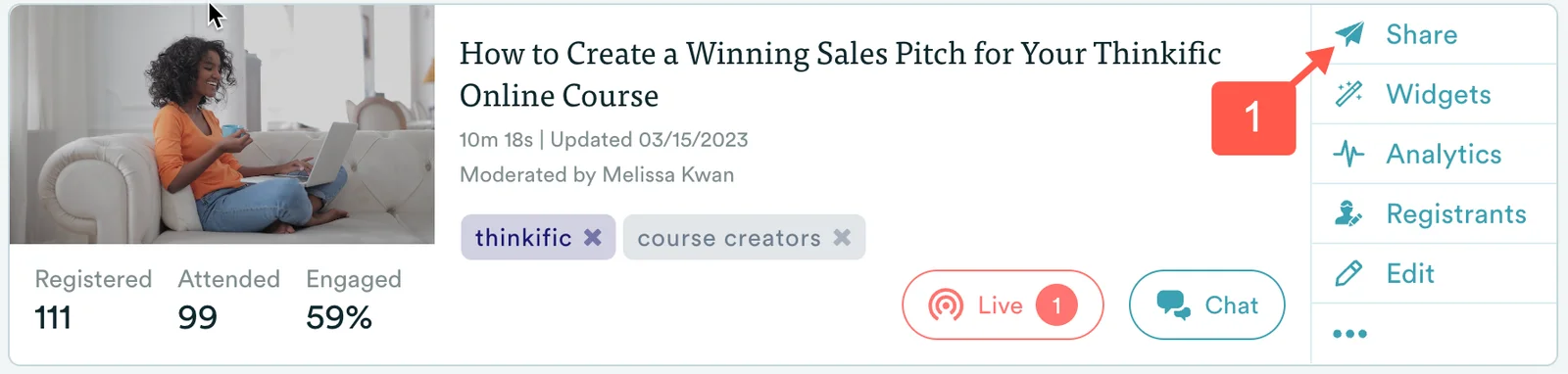 - Login to eWebinar and click the Share button next to the eWebinar you wish to embed in your course.