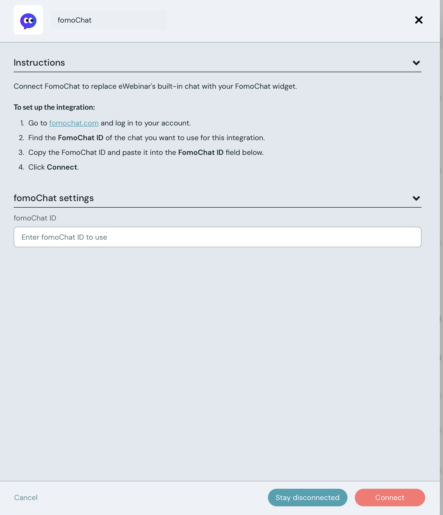 To set up the FOMOchat integration, log in to your eWebinar account (or sign up for a free trial) then click Integrations in the profile menu, click FOMOchat under Available integrations, and paste in the FOMOCHAT ID from FOMOchat.