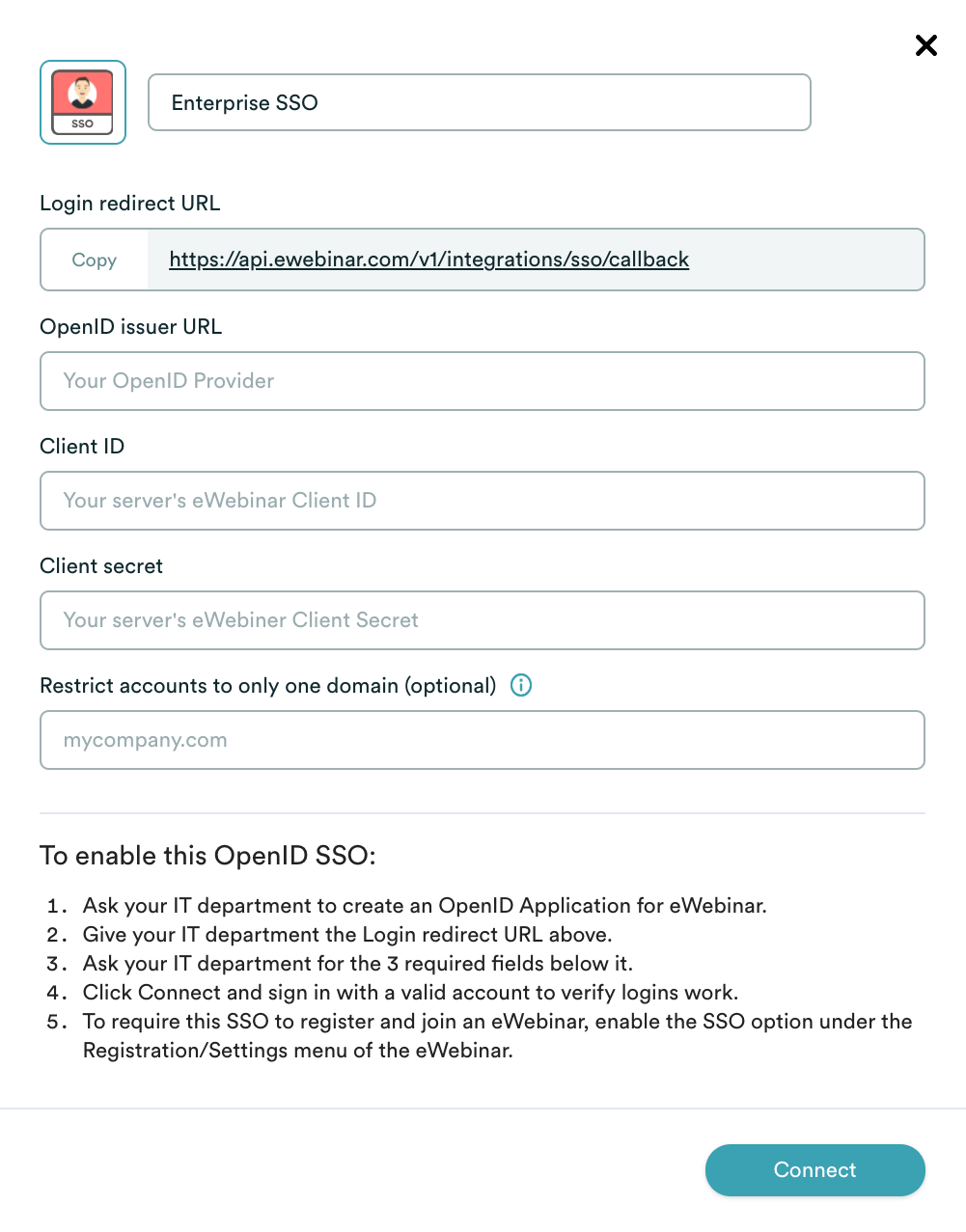 With eWebinar, you can configure a single-sign-on integration against your OpenID authentication provider. This means the employees of your company, and only your employees, will be able to seamlessly register for and attend your internal training and onboarding webinars provided they are logged into your system with their company credentials — a perfect solution for effective, engaging,and private internal webinars.